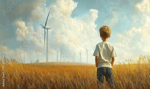 A boy is standing in a field looking at a wind farm