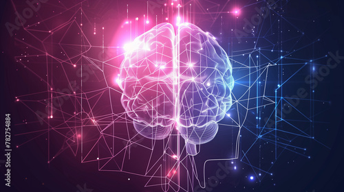 A brain is shown in a purple and blue background with a lot of lines. The brain is surrounded by a lot of lines and he is a computer generated image. Scene is somewhat abstract and futuristic