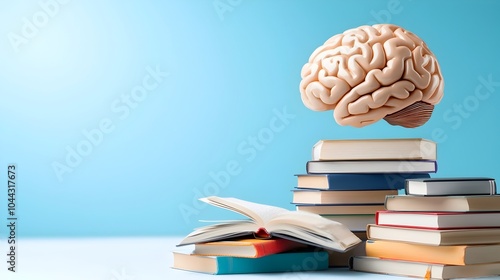 A brain suspended above stacks of books merging abstract designs and colors to symbolize the power of creativity and the pursuit of education and knowledge