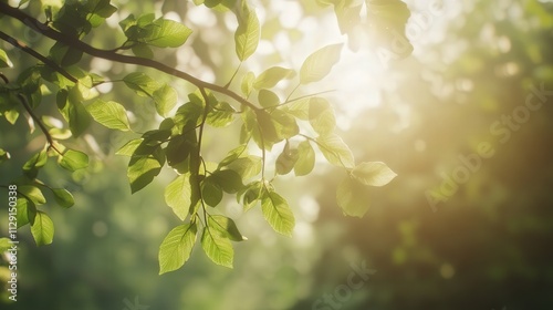 A branch heavy with fresh green leaves, each leaf catching the gentle morning light, adding a soft, natural glow to the scene