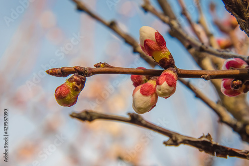 A branch of a fruit tree with white-pink buds that will soon open into a flower