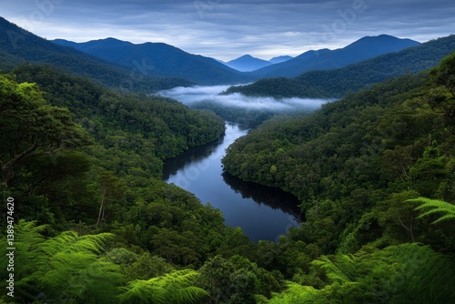 A breathtaking aerial view of a dense rainforest with mist rolling over the treetops
