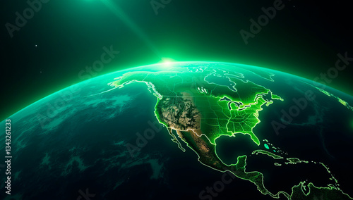 A breathtaking aerial view of the Earth with glowing green energy lines wrapping around the planet, representing the global impact of environmental conservation
