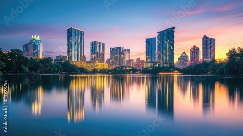 A breathtaking cityscape at dusk with tall buildings reflecting in calm waters, showcasing the balance of nature and urbanization.