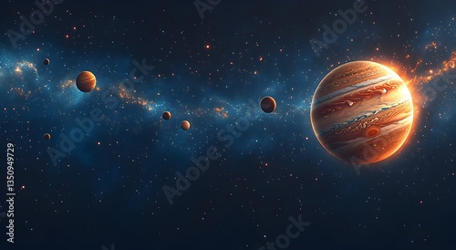 A breathtaking cosmic panorama showcases Jupiter and its moons orbiting within a vibrant nebula of swirling gas and dust.