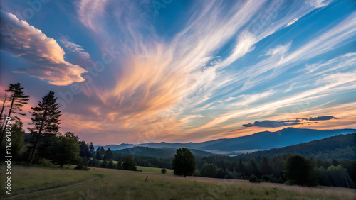 A breathtaking natural landscape featuring a wide, colorful sky during sunset.