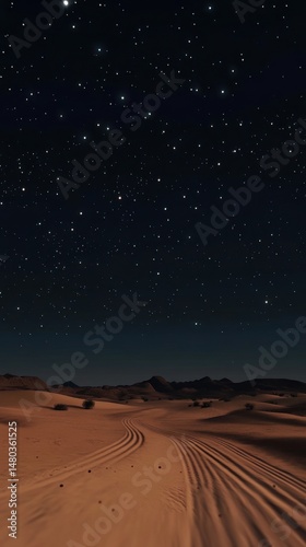 A breathtaking night view of a desert landscape with tire tracks under a starry sky.