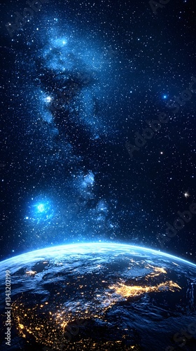 A breathtaking panoramic view from space showcases Earth's vibrant city lights against the backdrop of a majestic, star-studded Milky Way galaxy, illustrating global network