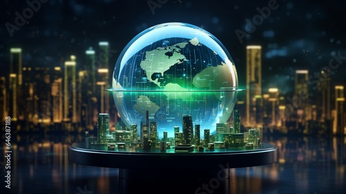 a breathtaking scene featuring a glass globe with a holographic display of sustainable energy statistics, emphasizing the global impact of green technology adoption