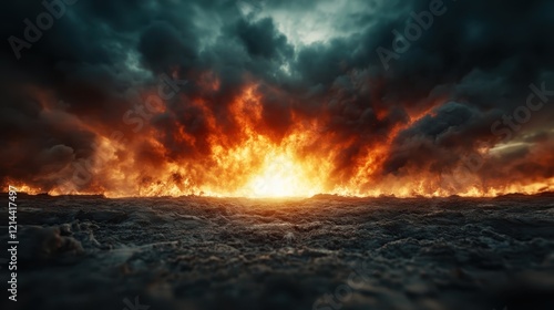 A breathtaking scene of a fiery horizon illuminating dark clouds and turbulent waters, showcasing nature's power and intensity in an awe-inspiring display.