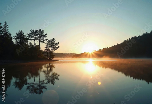 A breathtaking sunrise creates a perfect reflection on a serene, misty lake, with silhouetted trees on the shore creating a peaceful and tranquil morning scene.