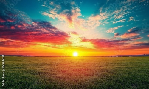 A breathtaking sunset casts bright colors across the sky, transforming the horizon above a vast open field into a vibrant display of nature's beauty