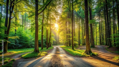 A breathtaking view of a crossroad surrounded by tall trees and green foliage in the midst of a sunlit summer forest, intersection, sunlit, exploration, tranquility, sunlight, summer