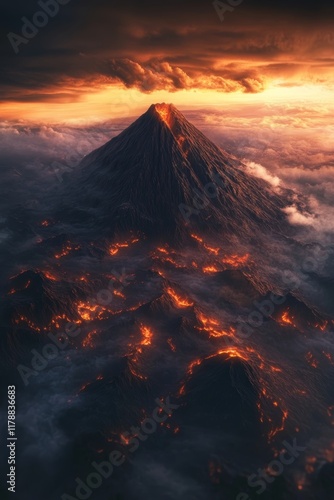 A breathtaking view of a volcanic eruption with vibrant lava flows under a dramatic sunset sky, surrounded by clouds.