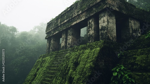 A breathtaking view of an ancient Mayan city, Tikal, with temples and pyramids covered in greenery and vegetation at dawn with soft golden light.