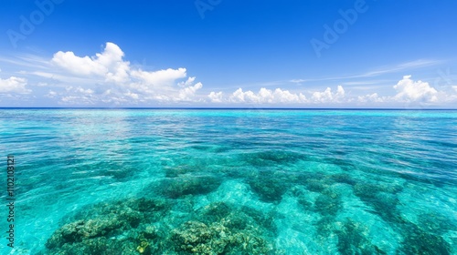 A breathtaking view of crystal-clear turquoise waters, vibrant coral reefs, and a bright blue sky adorned with fluffy white clouds.