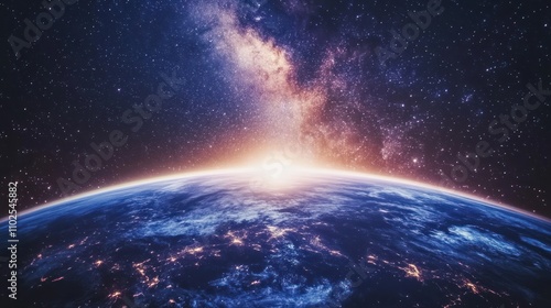 A breathtaking view of Earth from space, showcasing the Milky Way and sunrise on the horizon.