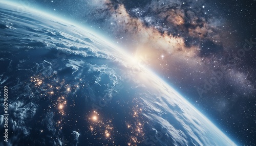 a breathtaking view of earth's curvature transitioning into the vibrant expanse of the milky way galaxy with city lights twinkling below.