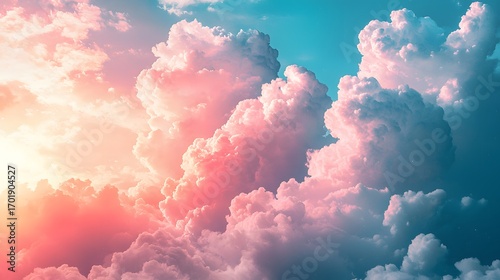 A breathtaking view of fluffy, pastel-colored clouds against a vibrant, colorful sky, showcasing a soft, dreamy atmosphere.