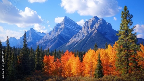 A breathtaking view of rugged mountain peaks in the distance, with vibrant autumn colors on the trees in the foreground.