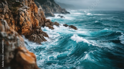 A breathtaking view of turbulent ocean waves crashing against rugged cliffs under a moody sky, showcasing nature's raw beauty.