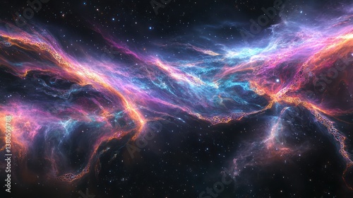 A breathtaking vision of interwoven fractal nebula tendrils, stretching across the cosmic horizon, glowing with iridescent colors that seem to