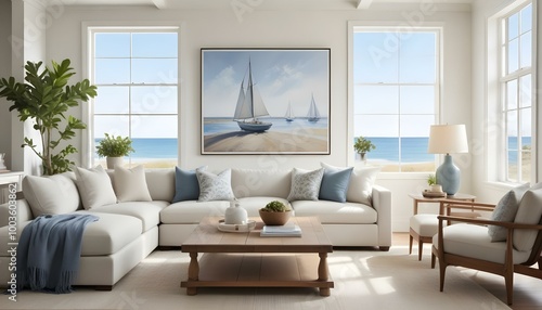 A bright, airy living room with large framed artwork depicting a serene beach scene with a sailboat in the distance. The room features white walls.