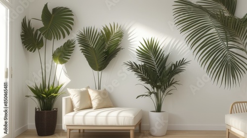 A bright and airy minimalist living room featuring various indoor plants, a comfortable white chaise lounge, and natural light.