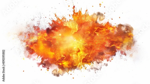 A bright and fiery explosion with orange and yellow flames, set against a white background.