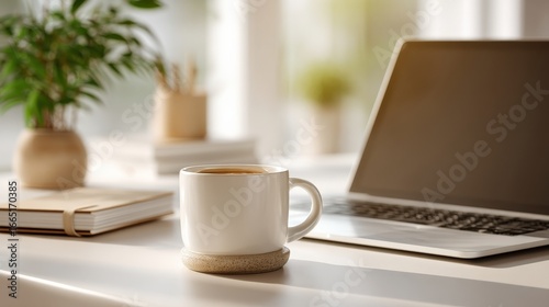 A bright and inviting home office scene with a laptop, coffee mug, and a book on a desk bathed in warm morning sunlight