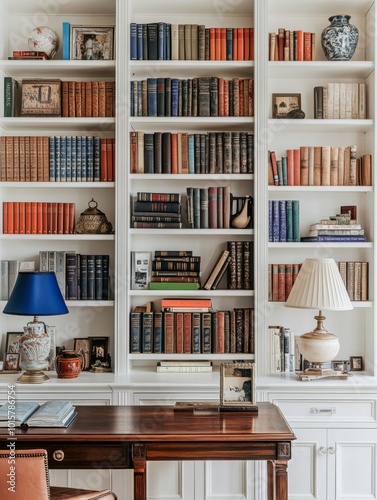 A bright and inviting office space featuring white bookshelves filled with books and vibrant color accents.