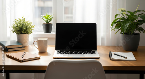A bright and organized home office desk with a computer, coffee, and notebooks near a window.