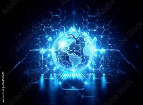 A bright blue globe, illuminated by radiating light, sits at the center of a dark digital space, surrounded by hexagonal patterns and upward-pointing arrows, evoking futuristic technology.