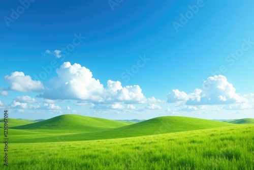 A bright blue sky with fluffy white clouds stretches above a rolling hills landscape, vast, fields, cloudy