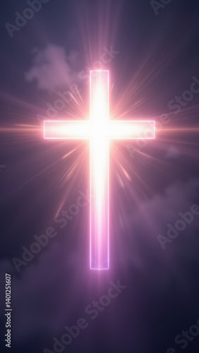 A bright cross shining on a purple background with white light rays emanating from its center.