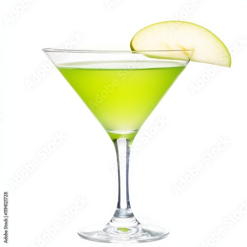 A bright green appletini with a thin apple slice on the rim, crisp and tart, isolated white background