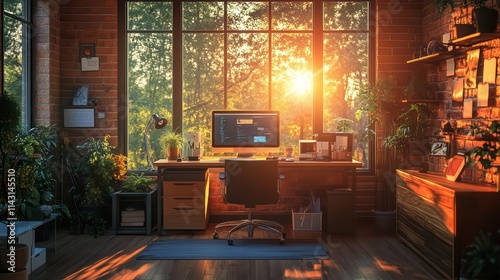 A bright home office where glowing automated schedules sync seamlessly across all connected devices, sunlight creating depth