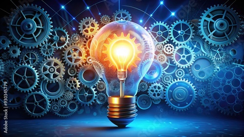 A bright lightbulb surrounded by gears, cogs, and sparks, symbolizing innovative ideas, creativity, and initiative, set against a dark blue background with subtle gradient effects.