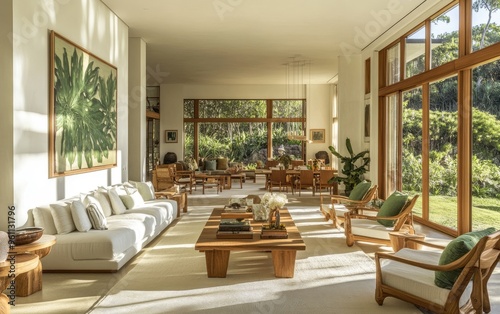 A bright living room with wooden furniture, green sofas and coffee tables, white walls, and large windows overlooking the garden. Created with Ai