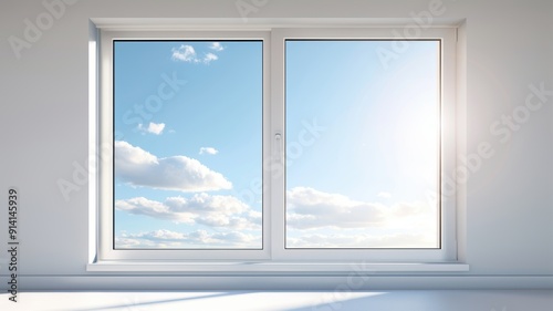 A bright, modern window framing a picturesque sky with fluffy clouds, enhancing the spaciousness of an empty interior.