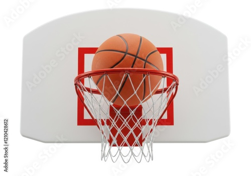 A bright orange basketball going through a red hoop with a white net isolated on white background