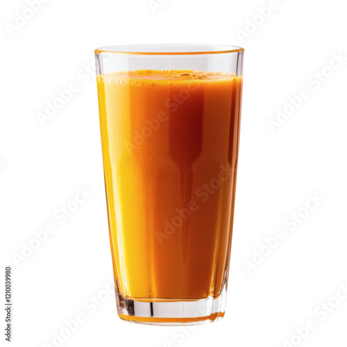 A bright orange carrot smoothie in a modern glass, floating on a clean white background.