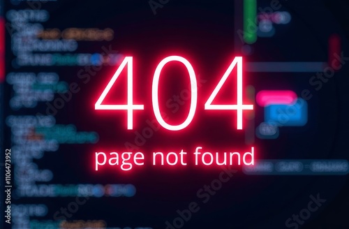 A bright red 404 page not found message appears on a dark background filled with coding snippets. The screen symbolizes a common internet error, encountered during web browsing.