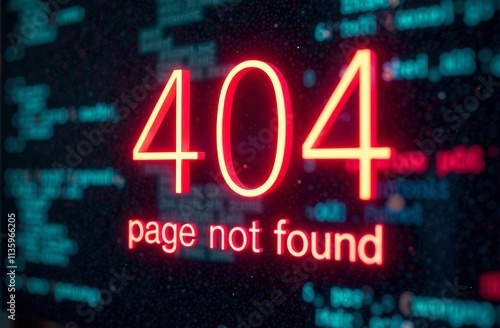 A bright red error message shows 404 page not found against a dark, coded background, indicating a missing webpage in a digital environment. The striking color contrasts with the surrounding text.