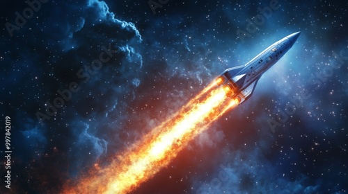 A bright rocket ascends rapidly into the night sky, emitting a powerful plume of orange flames. Stars and cosmic clouds create a stunning backdrop, highlighting the awe of space exploration.