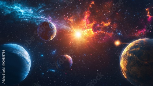 A bright star casts light on orbiting planets, highlighting them against a backdrop of nebulae and twinkling stars.