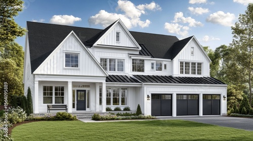 A bright white farmhouse with a steep black roof, featuring large garages, windows, and a small porch bench amid a green yard.
