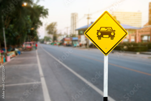 A bright yellow sign indicating designated parking spots for cars along the roadside, ensuring organized parking and smooth traffic flow in urban areas.
