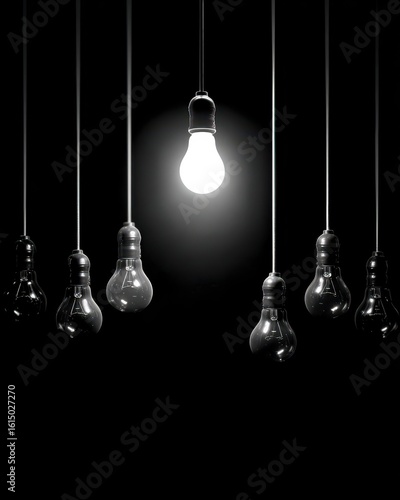 A brightly lit lightbulb hangs amongst darkened, unlit bulbs in stark contrast