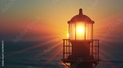 A brilliant sunset casts vibrant rays of light behind a lighthouse overlooking the ocean, symbolizing guidance and hope.